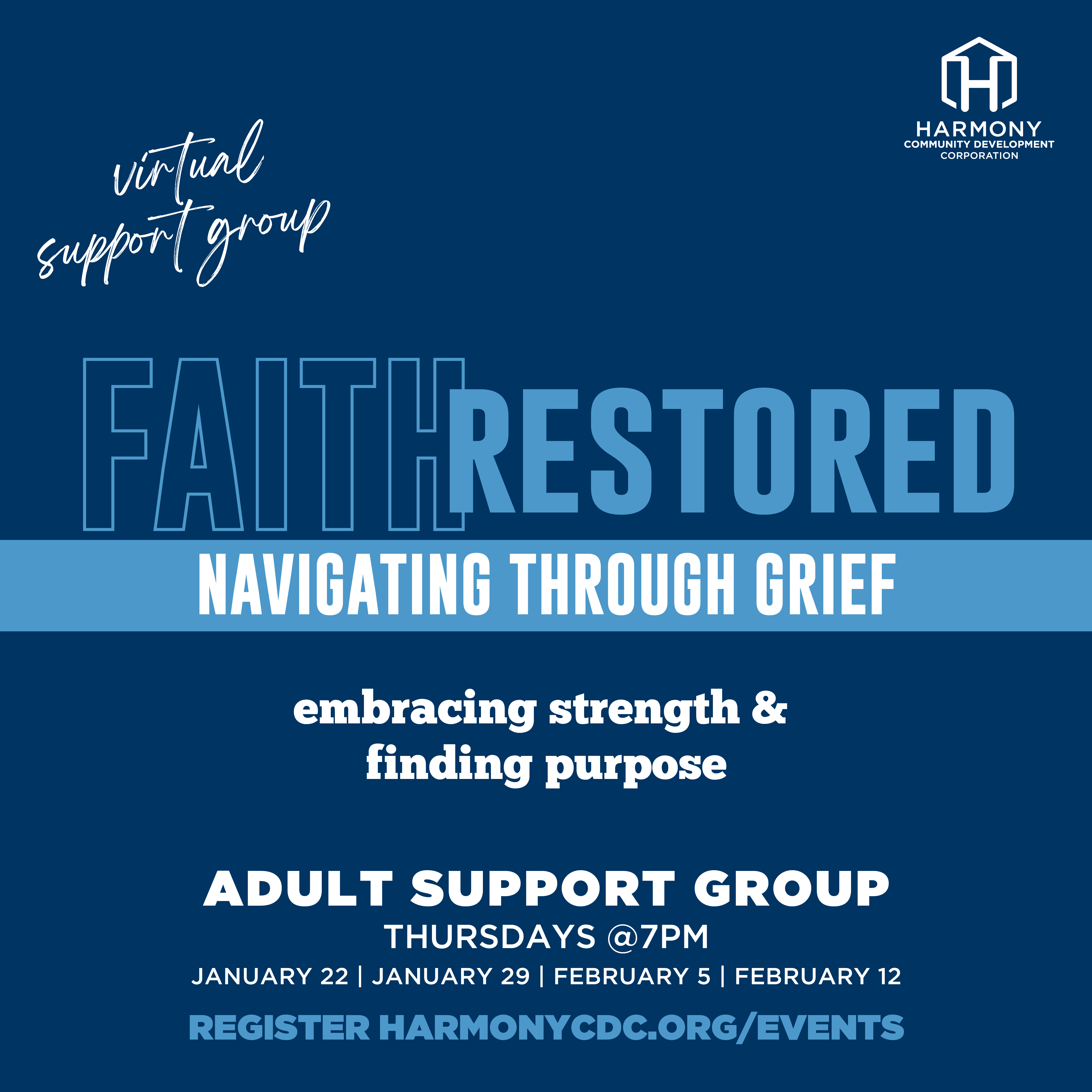 Faith Restored is a virtual support group designed to provide a safe, supportive space for adults navigating grief. Through guided conversation and community connection, participants will find encouragement, strength, and renewed purpose.